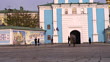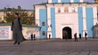 a monk coming out of the St. Michaelå«s Golden Domed Monastery in winter time, walking on the Mykhailiv Square