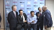 MS ZI CU TD TU Muhammad Ali making fist, posing for paparazzi with the Mayor of Louisville, Kentucky Greg Fischer, Len Amato, Donald Lassere & biographer/photographer Howard Bingham on the red