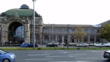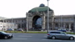 Road traffic and pedestrians in front of the main station in Nuremberg in autumn.