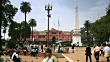 Pigeons maneuver through crowds of visitors in front of Casa Rosada and Piramide de Mayo in Buenos Aires, Argentina.