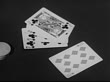 MOT 1952: GAMBLING: POKER: Possible 'flush' (7,6,2, Jack of clubs) cards facing up on table, one card face down, male hand turning card over REVEALS 10 of diamonds. VO 'Jack O'Diamonds': 'Didn't play his cards right' had him figured for 'a four flusher'