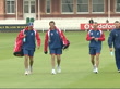 England v Sri Lanka: Preview: England training; ENGLAND: London: Lords:EXTEngland cricketers Michael Vaughan and Monty Panesar along / Jon Lewis along / Alistair Cook and Marcus Trescothick along / Panesar, Sajid Mahmood and Liam Plunkett bowling (all just warming up) /Vaughan talking to England Coach Duncan Fletcher (who has back to camera) / Plunkett / Panesar / Mahmood / Matthew Hoggard / Andrew Flintoff fooling about with coaches / Flintoff picking nose /Team in huddle / Trescothick jogging / Flintoff and Plunkett jogging / Flintoff / Kevin Pietersen jogging with Andrew Strauss / Cook jogging / Flintoff doing sit-upd / players stretching / Trescothick stretching over exercise ball / Strauss stretching / Flintoff sitting on ground