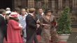 Queen Elizabeth II, Duke of Edinburgh and Prince William and Prince Harry attend wedding of Tamara Grosvenor; ENGLAND: Chester: Chester Cathedral:EXT**SOME FLASH PHOTOGRAPHY**Queen Elizabeth II (wearing purple coat and hat) and Prince Philip, Duke of Edinburgh with Gerald Grosvenor (Duke of Westminster) along from cathedral. and into awaiting car / Natalia Grosvenor (Duchess of Westminster) chatting to Prince William and Prince Harry as all out of cathedral with others / general views of William and Harry chatting with others and into awaiting cars.