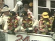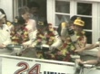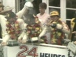 LE MANS, FRANCE - JUNE 16: (AUDIO OMITTED) Race winners Paolo Barilla, Klaus Ludwig and “John Winter” celebrate their victory with a spray of champagne on the podium after the Le Mans 24 Hours at Circuit de la Sarthe, on June 16, 1985 in Le Mans, France. (Footage by Duke Video/Getty Images)