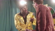 A fun depiction of a competitive TV game show, stylized in late 1970's or early 1980's fashion. The host, an African American man in a stunning gold blazer, watches as contestants spin a colored wheel to win cash prizes.