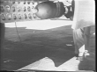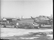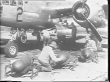 B-52's sit on a landing strip / Men adjusts the bombs / Tail ends of the V-T are tightened / Man loads and raises the V-T fuse bombs onto the bomber.