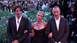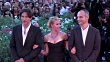 Scarlett Johansson on the red carpet along with Jonathan Glazer and Paul Branningan wearing a black dress at the 70th Venice International Film Festival in 2013.