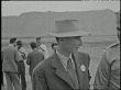 Scientist J. Robert Oppenheimer and U.S. General Leslie Groves talk together at an atomic test site in Los Alamos, New Mexico.