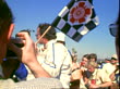 DAVID PAUL MARTIN seated behind wheel of Porsche 914 sports coupe parked in pit alley of Ontario Motor Speedway / leaning beside David Paul Martin is professional race car driver RODGER WARD / DICK SMOTHERS driving winning Porsche 914 into winner's circle, professional race car driver BOBBY UNSER standing in passenger seat and holding checkered flags / Dick Smothers and Bobby Unser posing in victory circle, holding and waving checkered flag, being kissed by young woman. OMS Celebrity Pro-Am on August 09, 1970 in Ontario, California (Footage by Getty Images)