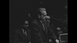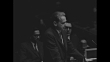 UN Secretary General Dag Hammarskjold speech at podium about Paramount Pictures documentary / he finishes speech and turns from podium, pan to applauding audience in General Assembly Hall