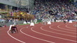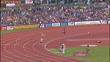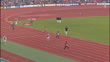 Sequence GVs from start of the Men's 4 x 400m Relay Race at the Commonwealth Games, including the starting pistol going off, sprinters heading off from the starting blocks, includes views of the first sprinters from each team, Australian sprinter, Bruce Frayne, English sprinter, Kriss Akabusi, Botswana sprinter, Sunday Maweni, Scottish sprinter, Martin Johnston, and Canadian sprinter, Anton Skerritt running around the race track, and handing over the relay baton to the second sprinters in each team, including Roger Black for England and Miles Murphy for Australia, shows Roger Black in the lead and handing the baton over to Todd Bennett. Meadowbank Stadium, Edinburgh, Scotland, UK; 1986 (BBC Sport - CWG 1986 Commonwealth Games - Athletics - 1458-1533 14570202 - 15130702 - 02/08/1986 - AEXZ134L)