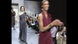 Sequence of shots of the finale at the Chanel Ready to Wear fashion show, as part of Paris Fashion Week Autumn/Winter 1989-1990. Karl Lagerfeld was chief designer at Chanel at the time. Shots include; model, Inès de La Fressange, walking the runway/catwalk, wearing a red, halter neck, satin evening dress with black evening gloves, a view of Inès with other models coming out onto the stage and joining her (the Chanel logo can be seen at the top of the catwalk), cuts to Gilles Dufour and other members of Karl Lagerfeld's team backstage, cuts to a tracking shot as models walk past the camera in a line on the catwalk, we see a shot of Karl Lagerfeld standing with all the models in Chanel standing and applauding around him, he gives a brief smile and wave to the audience, and ends on a shot of the models leaving the stage. Paris, France; 1989 (RSEA650F - AEVZ001J)