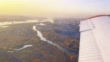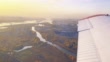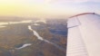 shot of airplane window passing over clouds in partly cloudy day nice weather, airplane wing, engine , sunny day, raw footage with no color correction sunset