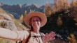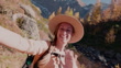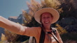 Happy woman wearing hat and backpack hiking on a rocky trail surrounded by autumn trees. Joyful adult enjoying outdoor adventure in nature. Smiling person on fall hike in forest.