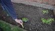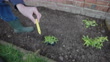 Gardener writing with pencil on yellowish plastic plant label. Six spinach seedlings in black container. Rhubarb and lemon verbena in field of view.