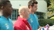 BLACKBURN, ENGLAND - SEPTEMBER 1: (AUDIO OMITTED) (L-R) Striker Yakubu, manager Steve Kean and center-back Scott Dean hold up team shirts as they pose for photos at Brockhall training centre on September 1, 2011 in Blackburn, England. (Footage by Niche Sport Media via Getty Images)