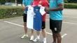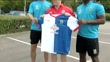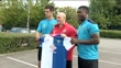 BLACKBURN, ENGLAND - SEPTEMBER 1: (AUDIO OMITTED) (L-R) Striker Yakubu, manager Steve Kean and center-back Scott Dean hold up team shirts as they pose for photos at Brockhall training centre on September 1, 2011 in Blackburn, England. (Footage by Niche Sport Media via Getty Images)
