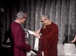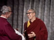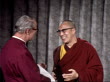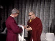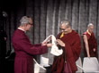 The Dalai Lama is greeted by Ronald Goodchild the Bishop of Kensington during his visit to the United Kingdom. 20 October 1973. (Core Number: ANB8466A)