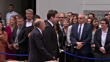 The newly appointed interior minister Gerard Collomb shakes hands with the man he is taking over from Mathias Fekl (Footage by AFPTV via Getty Images)