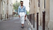 PARIS, FRANCE - MARCH 26: Theo Kimbaloula, fashion blogger, wears an H&M blue shirt, sunglasses, Imperial white pants, and Zara shoes, on March 26, 2017 in Paris, France. (Footage by Edward Berthelot/Getty Images)