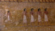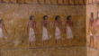 LUXOR, EGYPT - CIRCA 2002: Tomb of Seti I. MCU pan-right of a wall painting depicting the god Khnum standing inside a sacred canopy on a boat that is being dragged by four men with a rope.