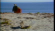 Tracking shot of a boat sailing along Cape Canaveral. There are two people visible on it, as well as a large pile of rubble and debris. Cut to a police officer (face not visible) unwrapping a large plastic wrapping to reveal a silver piece of metal inside it. Cut to a shot of the beach with the ocean and two people in the background. In the foreground there is a semi-cylindrical piece of rusted metal. Cut to a close up of a piece of metal lying on sand in the beach. A man wearing army fatigues kneels down and examines it. Cut to a man in army fatigues, possibly the same person, walking through tall grass near the beach. He is carrying a piece of silver metal that is wrapped in foam, likely a piece from the shuttle's heat shield.
