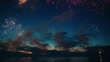 Slow motion video of fireworks above the ocean at twilight, with colorful explosions illuminating the night sky in a moment of celebration and beauty