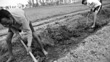 Two rural farmer digging in irrigation canal using garden hoe video portrait outdoor.