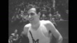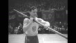 Two pole vaulters compete in the Knights of Columbus track and field meet at Madison Square Garden, with spectators and banners for Yale, Manhattan, Lafayette in bkgd; both make it over bar / sprinters begin race / sprinters cross finish line / spectators applaud / CU black male sprinter with NYPC on shirt / CU pole vaulter Bob Richards prepares to vault / Don Laz prepares to vault / runners jump hurdles / CU Harrison Dillard, sprinter and hurdler / sprinters run down track toward camera / CU white male sprinter / Note: documentation incomplete