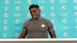 FRANKFURT AM MAIN, GERMANY - NOVEMBER 2: Tyreek Hill, #10, talks about being honored as he speaks to the media during a Miami Dolphins press conference at PSD Bank Arena on November 2, 2023 in Frankfurt am Main, Germany. (Footage by Alex Grimm/Getty Images)