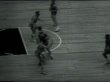 University of North Carolina topples Kansas Jayhawks with controlled-ball strategy that shackles Kansas fast-break game, final score, 54-53. Men's college basketball highlights. UNC coach Frank McGuire sits looking anxious (or intense) on sideline. Male & female cheerleaders running, jumping, cheering courtside. Wilt Chamberlain among Jayhawks players. North Carolina players on bench, cheer for teammates.