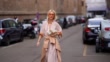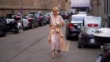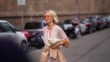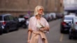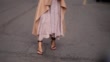 MILAN, ITALY - FEBRUARY 21: Viktoria Rader wears orange sunglasses, a pink floral print dress, a salmon-color coat around the waist, a white leather Bottega Veneta bag with a golden chain, outside Sportmax, during Milan Fashion Week Fall/Winter 2020-2021 on February 21, 2020 in Milan, Italy. (Footage by Edward Berthelot/Getty Images)