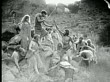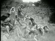 1914 B/W Wide shot Group of cavemen surrendering and bowing to caveman with bow and arrow - stock video