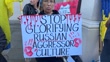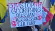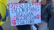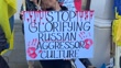 LONDON, ENGLAND - SEPTEMBER 11: A woman holds a signs that reads "Stop glorifying Russian aggressor culture" as Ukrainian protesters and supporters gather outside the premiere of Puccini's Tosca at the Royal Opera House on September 11, 2025 in London, England. The demonstration comes after 182 members of the Royal Opera and Ballet (RBO) sent an open letter expressing their dissent against the company's policies around the war in Gaza, resulting in the organization cancelling its production of Tosca at the Israeli Opera in Tel Aviv next year. Additional opposition to the show has come from supporters of Ukraine and is directed at the opera's star, Anna Netrebko, over the Russian soprano's perceived association with Vladimir Putin. (Footage by Carl Court/Getty Images)