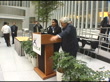 USA: Washington DC: World Bank Building:EXTunseen speaker's voice over pictures SOT Jim we'd like to thank you for what you've started at the bankLA GV World Bank building, cars passing in f/gINTLA GV foyer area TILT DOWN to James Wolfensohn (Retiring Head of World Bank) speaking to seated audience from podium SLOW MOTIONendsLMS Wolfensohn directing colleagues behind him to come and join him for photocall PAN