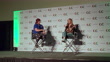 LAS VEGAS, NEVADA - OCTOBER 10: (L-R) Writer Jessica Mason and Caity Lotz speak with Jes Macallan, who is displayed on a screen via videoconferencing software during the "Caity Lotz & Jes Macallan (Legends of Tomorrow)" panel during the ClexaCon 2021 convention at the Tropicana Las Vegas on October 10, 2021 in Las Vegas, Nevada. (Footage by Gabe Ginsberg/Getty Images)